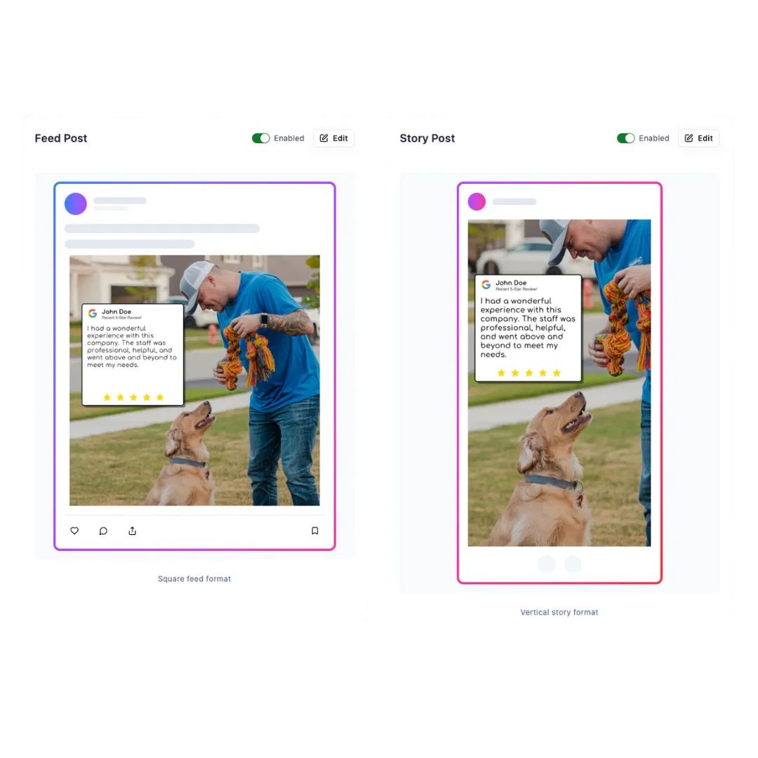 Posts review graphics to Facebook, Instagram, and Google Business Profile